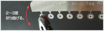 10連メスタグの真中のスリット部分を 折り曲げるか切り離してください。 ピアッサーはオスタグとメスタグの入れる装着口が 決まっており、赤いマークが付いている方が メスタグ用です。 ピアッサー先端のメスタグ装着口側のバネに相対 する位置にある凹み部分に、タグの先端を沿わせる ようにして10連メスタグの一つを挿入する。 次にピアッサー先端を軽く閉じて、挿入した10連メスタグを前後左右に動かし、当該のタグが所定位置にしっかりおさまっていることをご確認ください。さらに先端を強く閉じながら2,3度折り曲げを繰り返し、10連メスタグから当該の一つを 切り離してください。